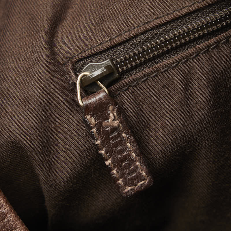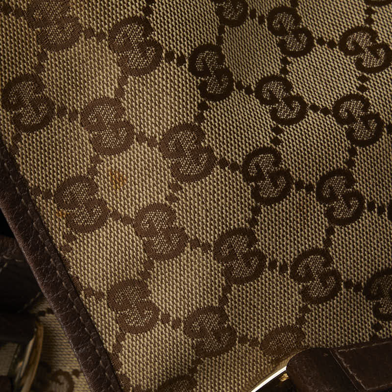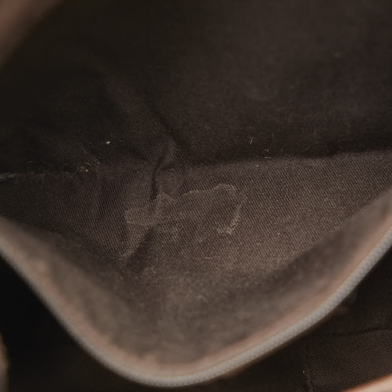 外側⇒汚れ サイド⇒若干のノリ染み 底面⇒汚れ、若干の角スレ ハンドル⇒型崩れ、コバに複数の亀裂 金具⇒小キズ・くすみ 開閉口⇒若干のスレ 内側⇒ファスナーポケット内に汚れ |