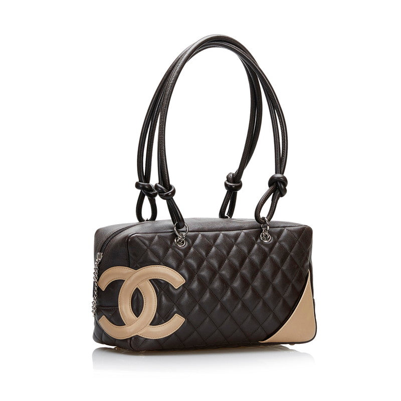 シャネル カンボン ボーリング ハンドバッグ ショルダーバッグ ダークブラウン ベージュ レザー レディース CHANEL 【中古】