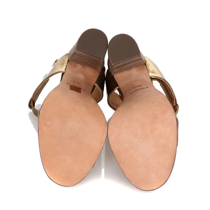 底部に若干のシミ・スレ、かかとにスレ、ヒールに若干のスレ、ゴールド部分に若干のスレはありますが、比較的キレイな商品です。 |