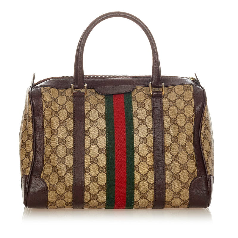 グッチ シェリーライン ミニボストン ブラウン グリーン レッド PVC レザー ハンドバッグ レディース GUCCI 【中古】