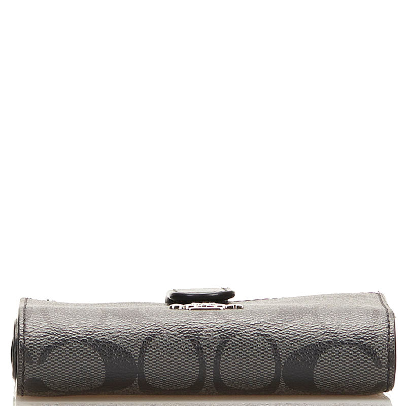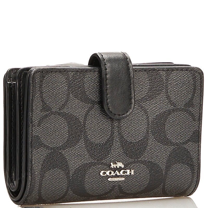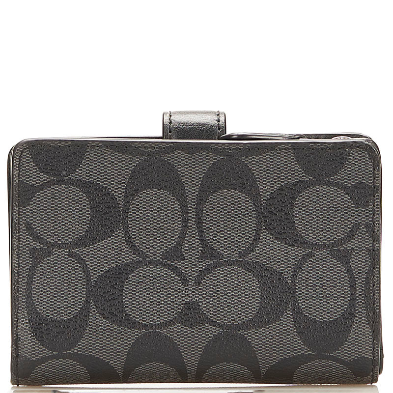 コーチ シグネチャー 二つ折り財布 コンパクトウォレット ブラック PVC レザー レディース COACH 【中古】