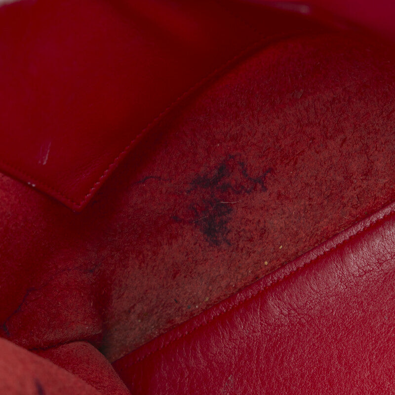 外側⇒型崩れ、スレ・キズ・汚れ サイド⇒型崩れ、スレ・汚れ、コバに亀裂 底面⇒スレ・キズ・若干の汚れ、角にキズ ハンドル⇒若干の黒ズミ、コバに亀裂 ショルダー⇒スレ・キズ・汚れ・ヨレ、コバに亀裂 金具⇒小キズ・クスミ、ファスナーに変色、底鋲にキズ・メッキはがれ 開閉口⇒コバに亀裂・僅かにスレ・汚れ 内側⇒スレ・色あせ・ペン跡・汚れ |