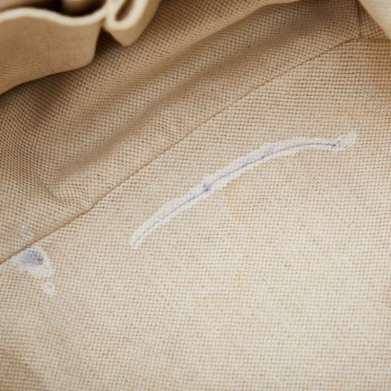 外側⇒型崩れ・スレ・薄汚れ・ヤケ 底面⇒型崩れ・スレ・ヤケ・角スレ・角に変色 ハンドル⇒スレ・ヤケ・汚れ・コバひび割れ・コバはがれ 金具⇒キズ・クスミ・メッキはがれ 開閉口⇒ヨレ・スレ・薄汚れ・汚れ・コバに汚れ・コバスレ・コバひび割れ、ファスナー持ち手にヨレ・ヤケ・シワ 内側⇒メインとポケット全体的に黄ばみ・色あせ・シミ・スレ・薄汚れ、底面全体的にシミ・ペン跡の上から塗装の自己補修跡、ポケットにノリ染み、レザーにスレ・ヤケ・シワ |