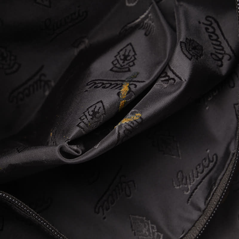 外側⇒スレ・僅かな変色・ひび割れ サイド⇒型崩れ・スレ 底面⇒変色・スレ ショルダー⇒ヨレ・ひび割れ・コバはがれ 金具⇒小キズ 開閉口⇒変色・ひび割れ 内側⇒ファスナーポケット内側にノリ染み、開閉口付近にファスナー跡・色移り |