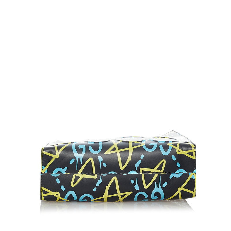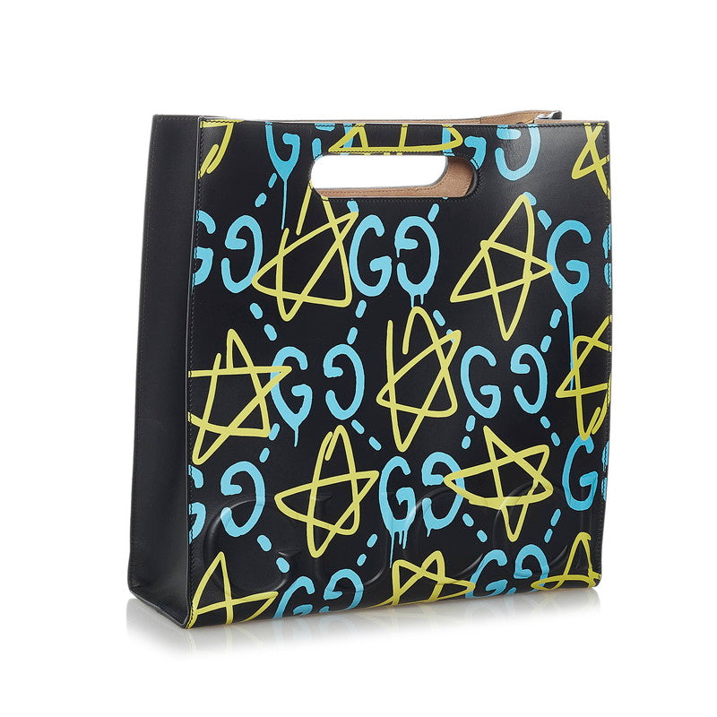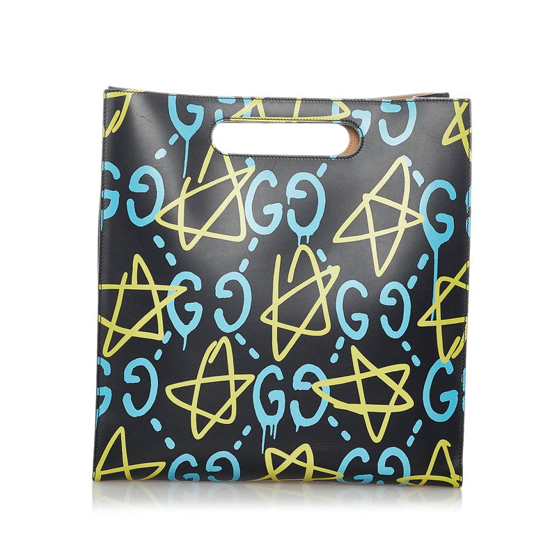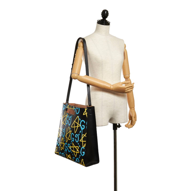 グッチ ゴーストプリントスター トートバッグ ショルダーバッグ 2WAY 414476 ブラック イエロー ブルー レザー レディース GUCCI 【中古】