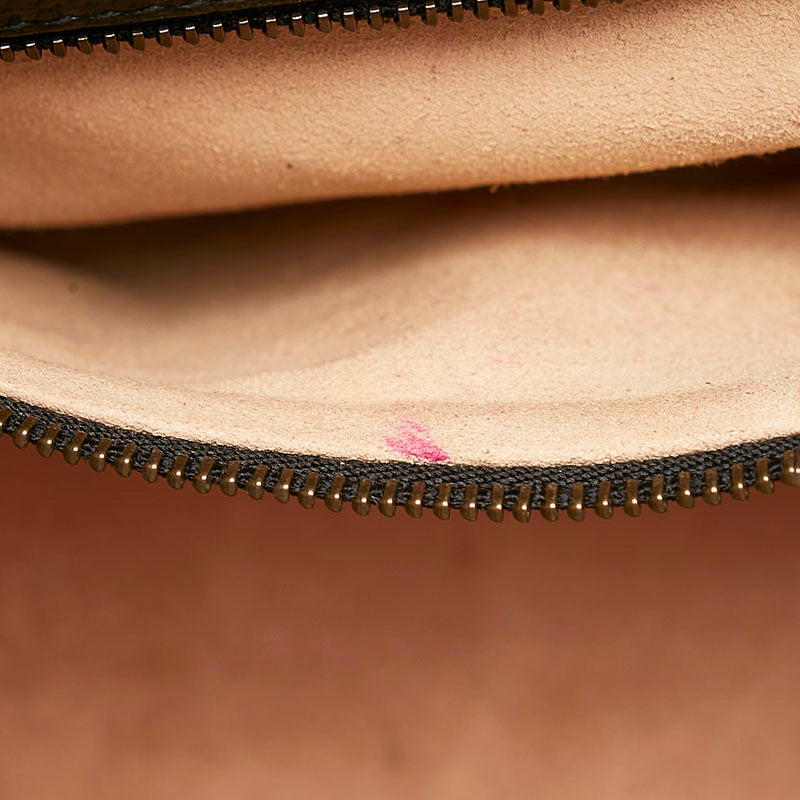 外側⇒キズ・僅かに汚れ 底面⇒僅かにスレ・型崩れ、角スレ ハンドル⇒僅かにコバスレ ショルダー⇒全体的に色移り・汚れ、レザー部分にスレ・汚れ 金具⇒小キズ・クスミ、ビジュー部分に小キズ フラップ付け根・裏⇒スレ・僅かに汚れ 開閉口⇒コバスレ 内側⇒レザー部分にスレ、裏地全体に薄汚れ、オープンポケット内にシール跡・薄いシミ、ファスナーポケット内に汚れ、薄いシミ におい⇒香水臭 |